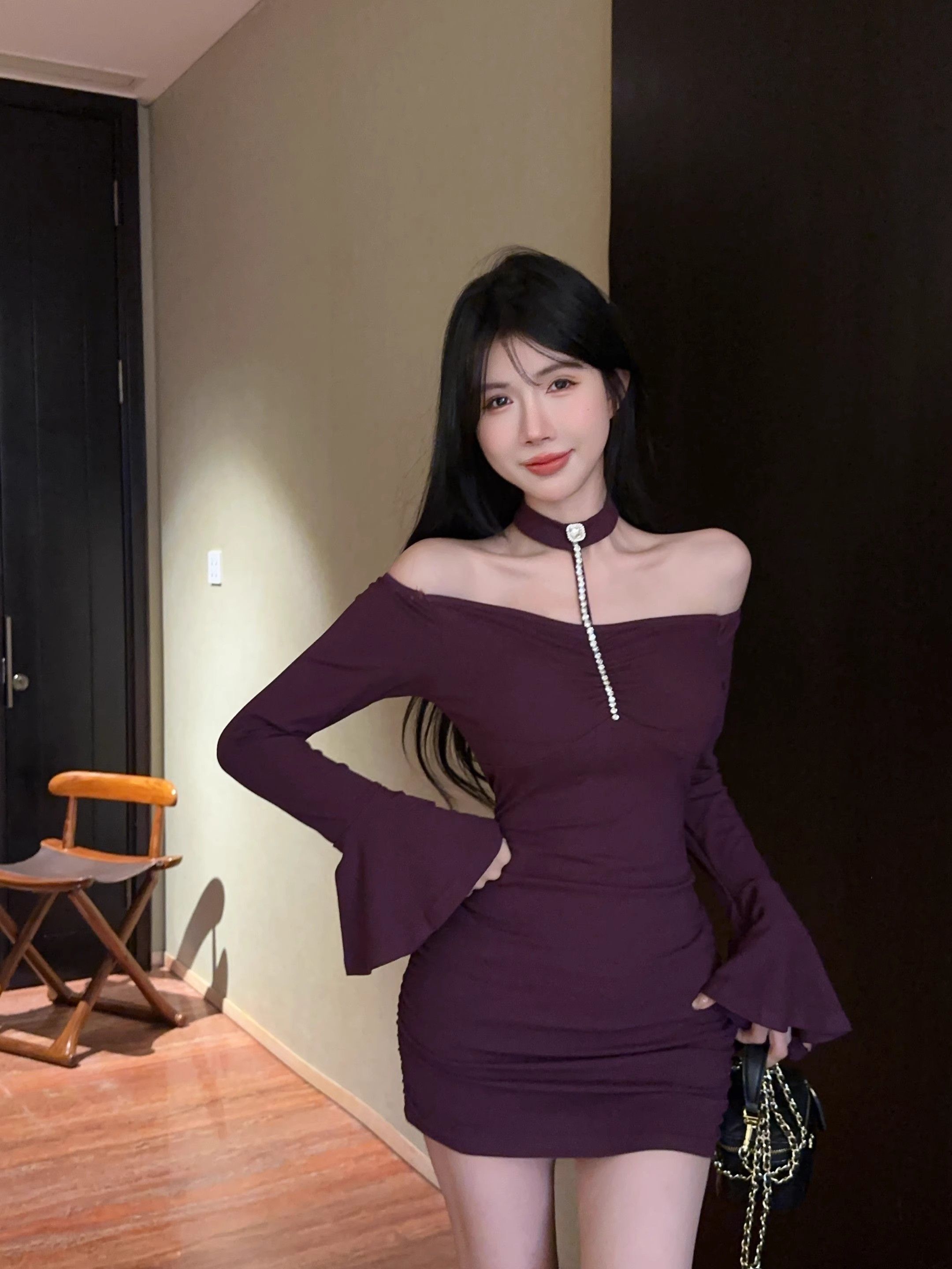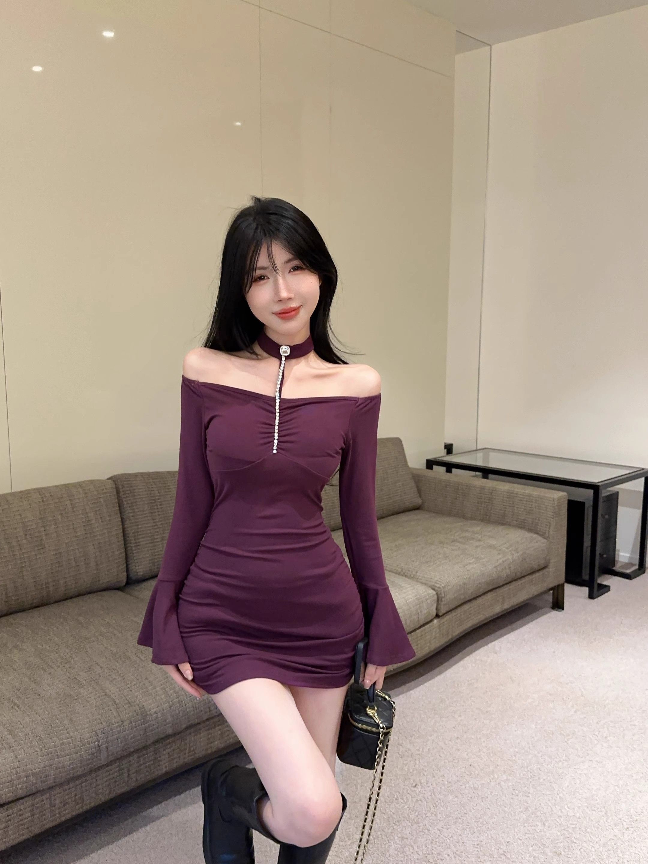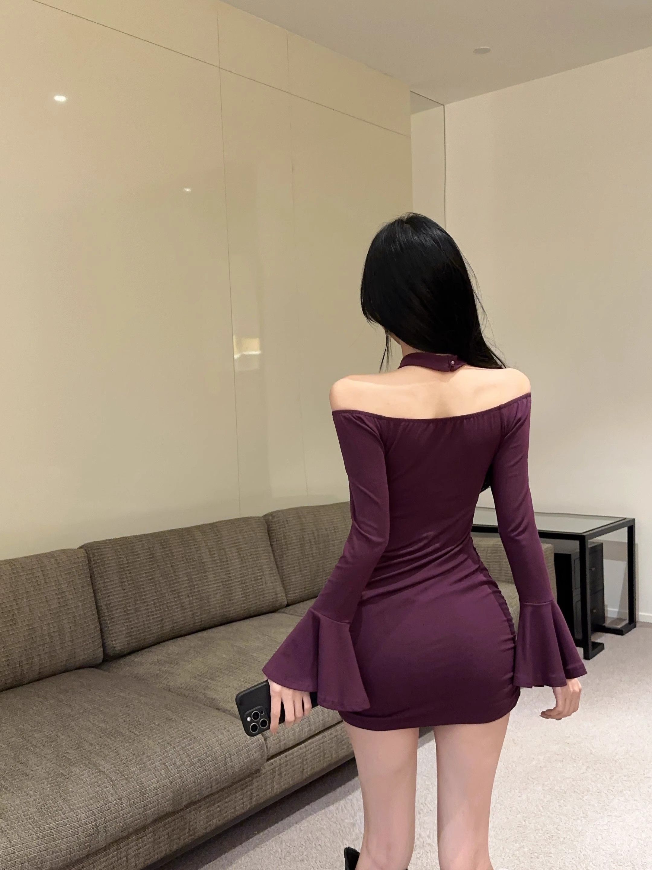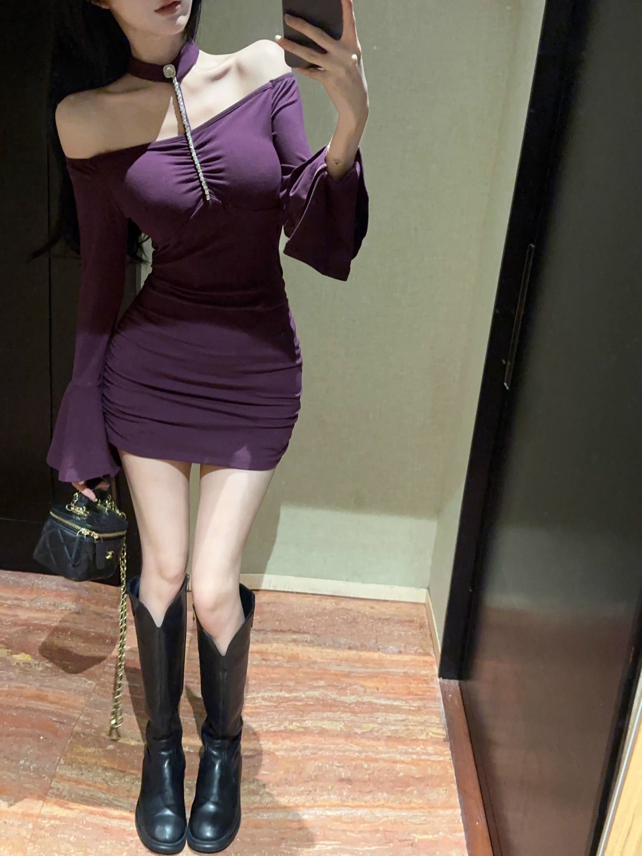 • 烫钻挂脖紫色连衣裙女秋冬名媛包臀小妈裙显身材喇叭袖一字肩裙子