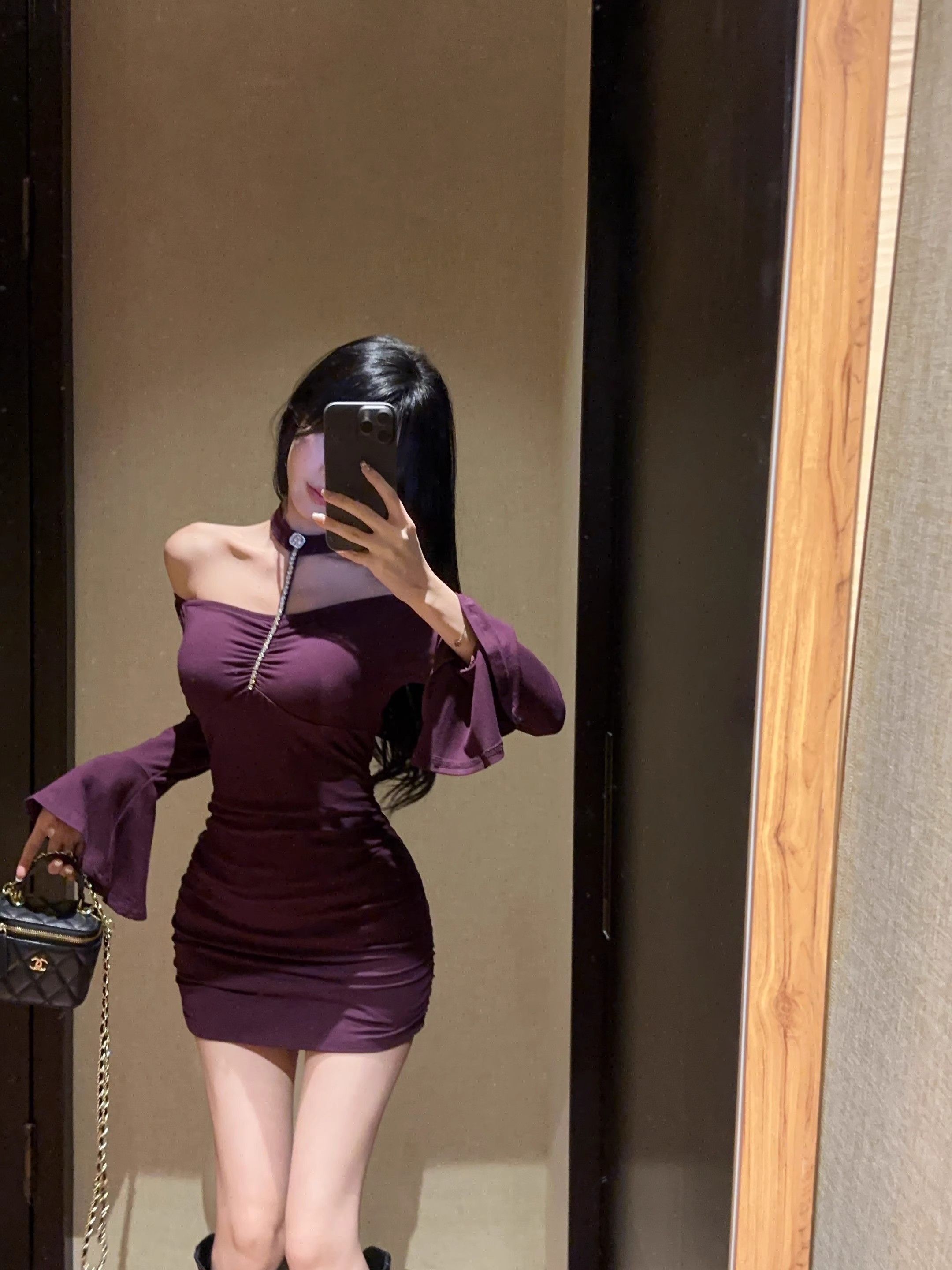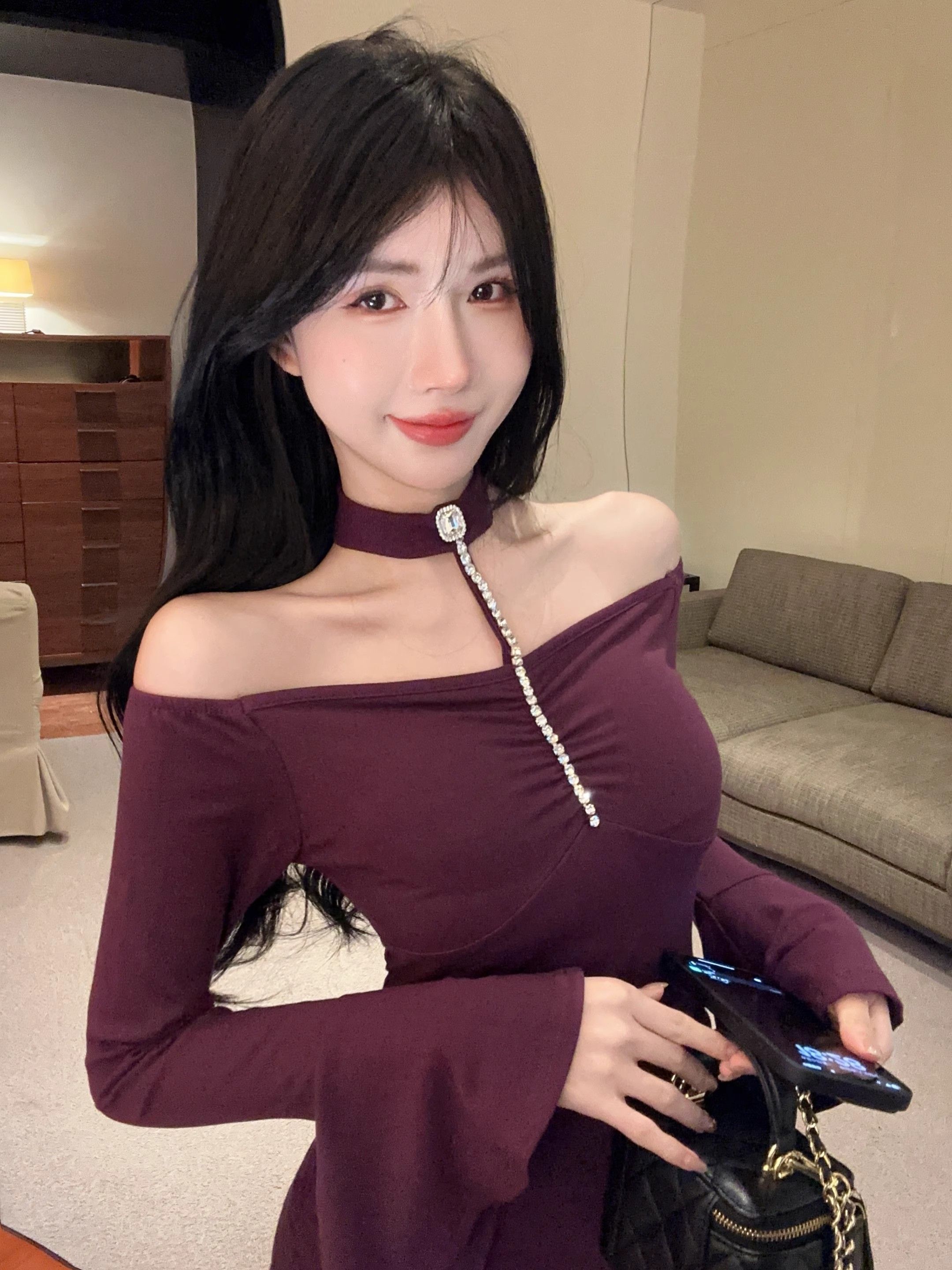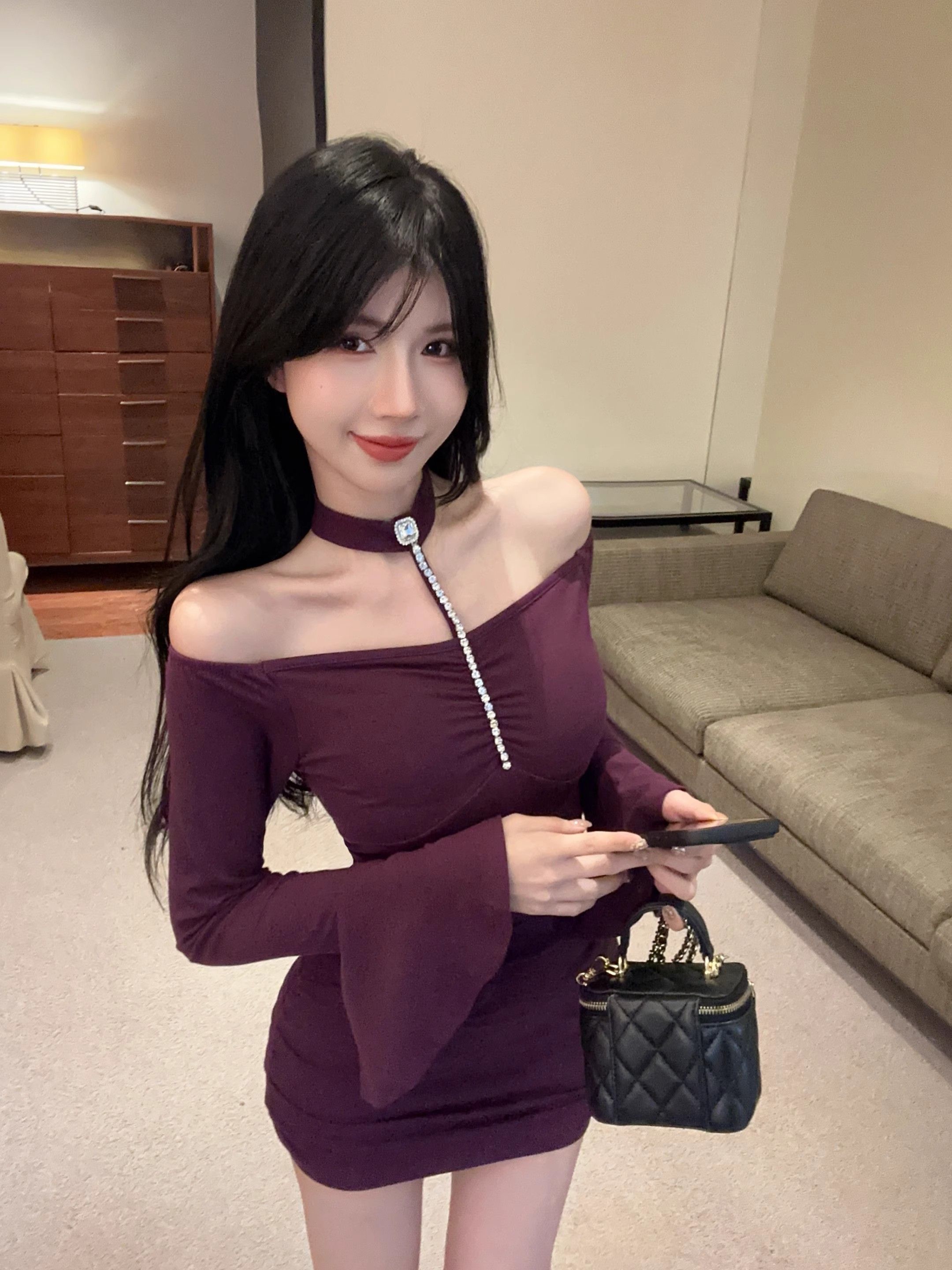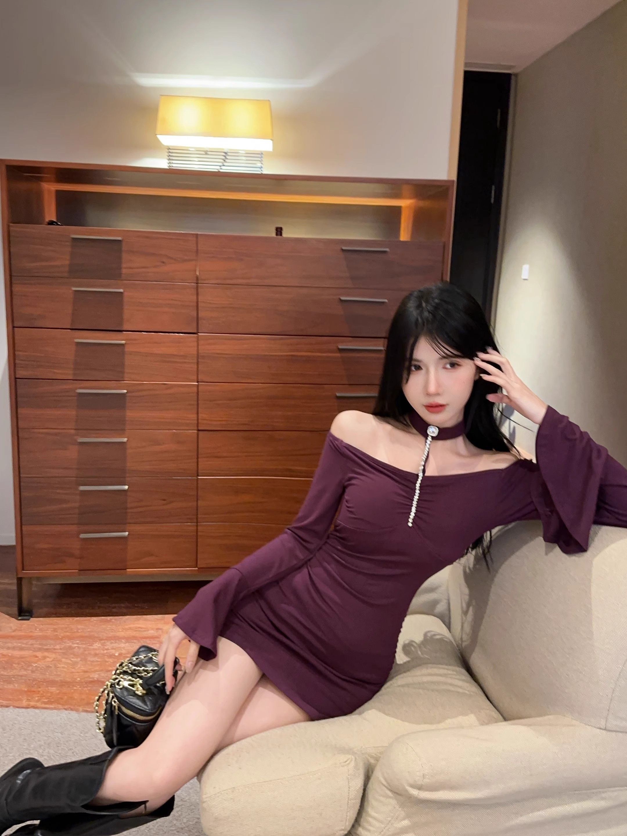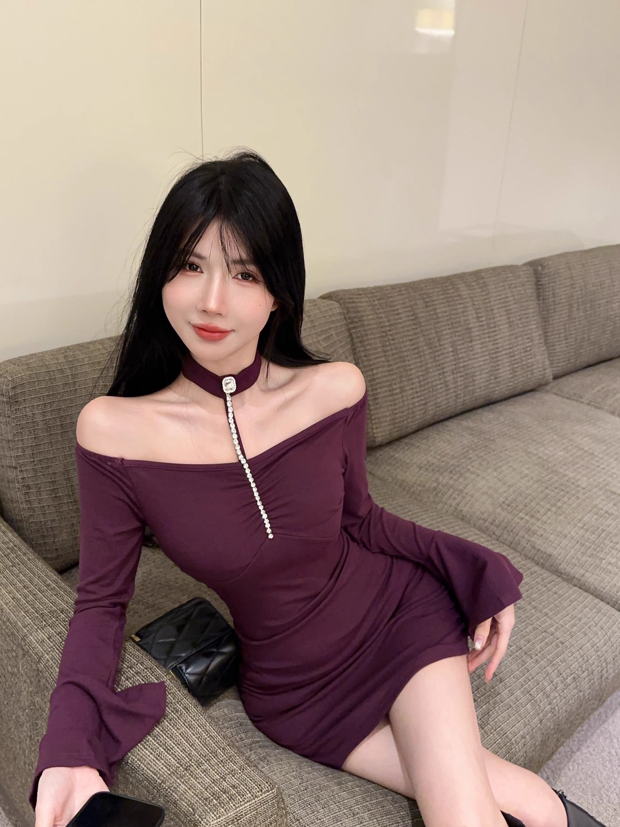 • 烫钻挂脖紫色连衣裙女秋冬名媛包臀小妈裙显身材喇叭袖一字肩裙子