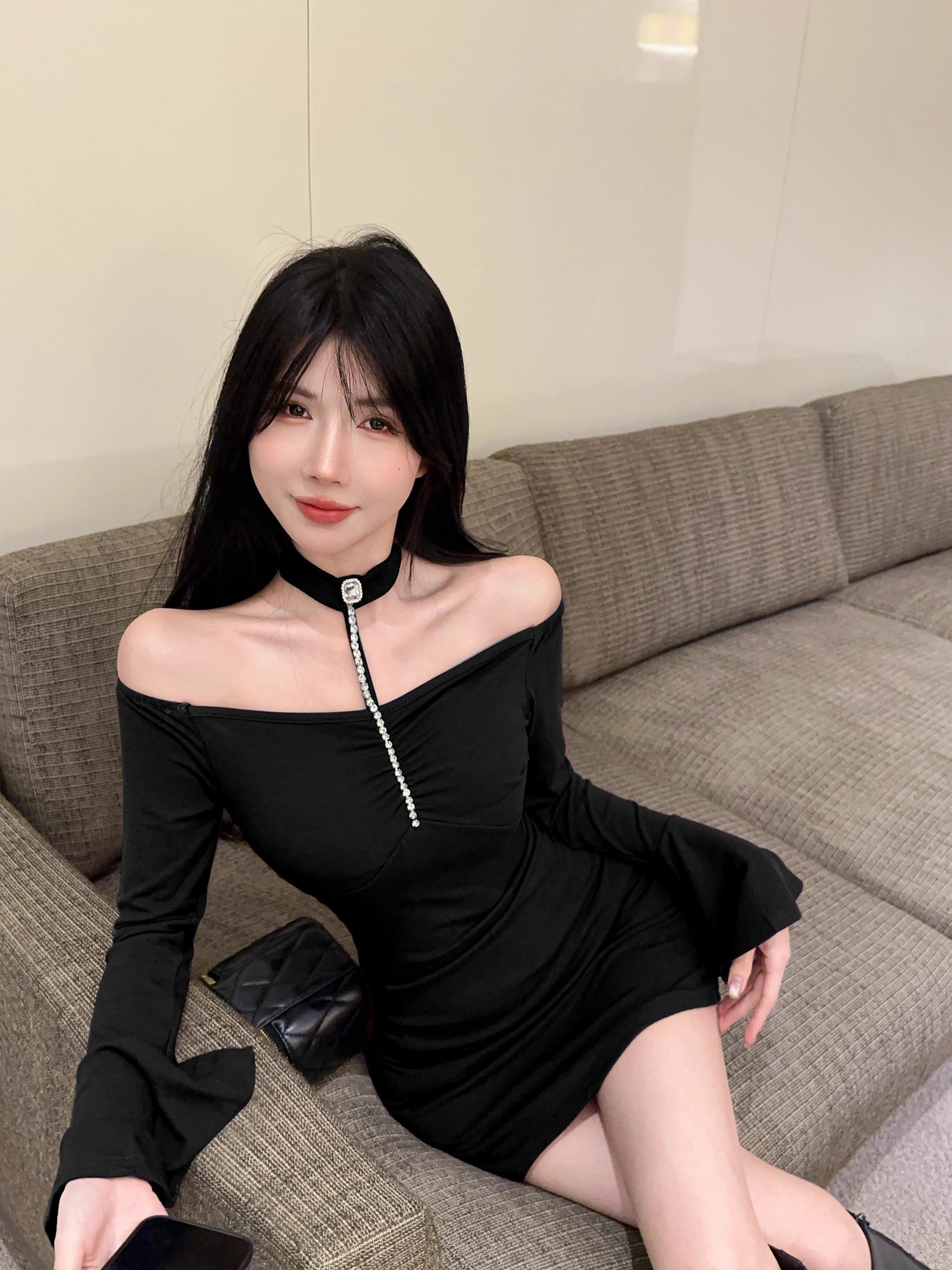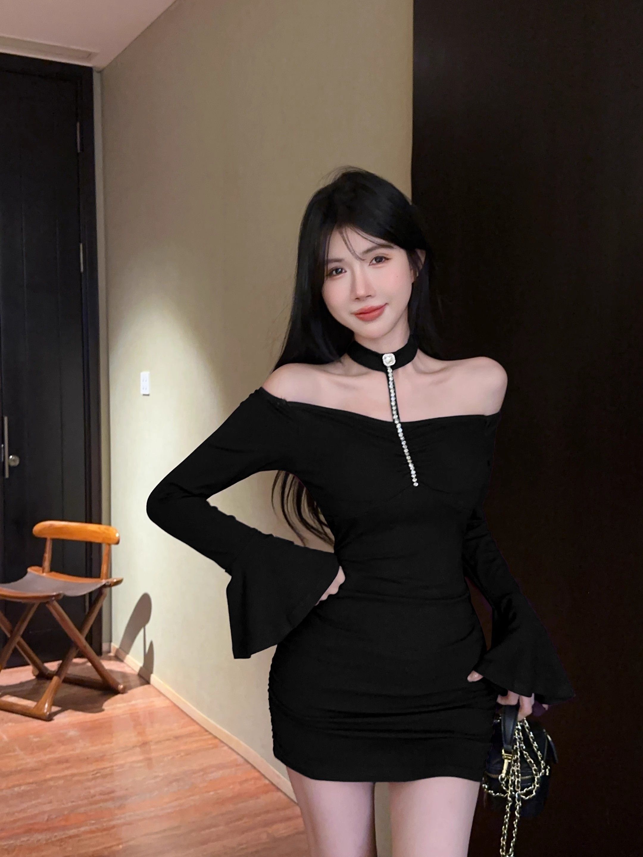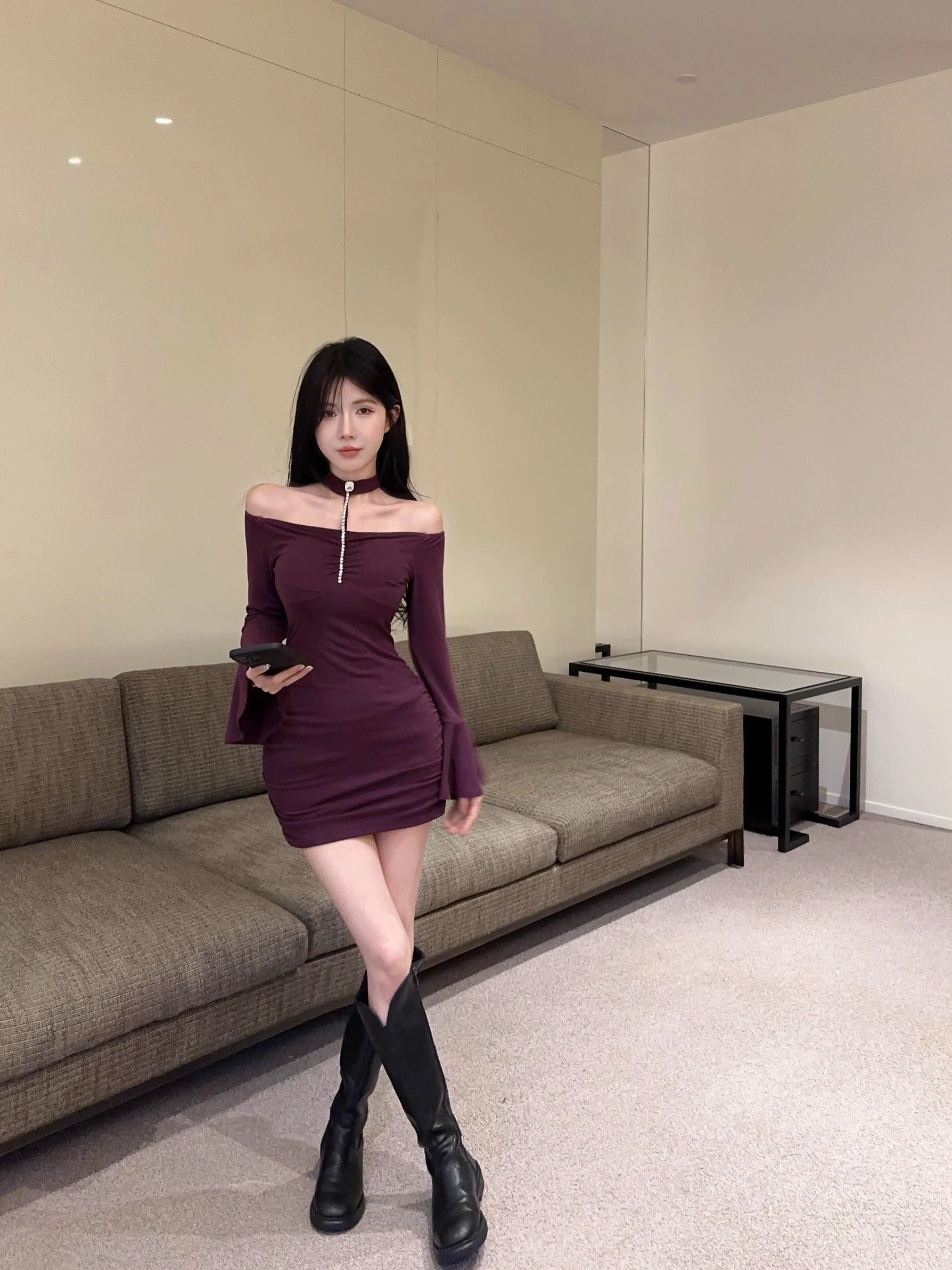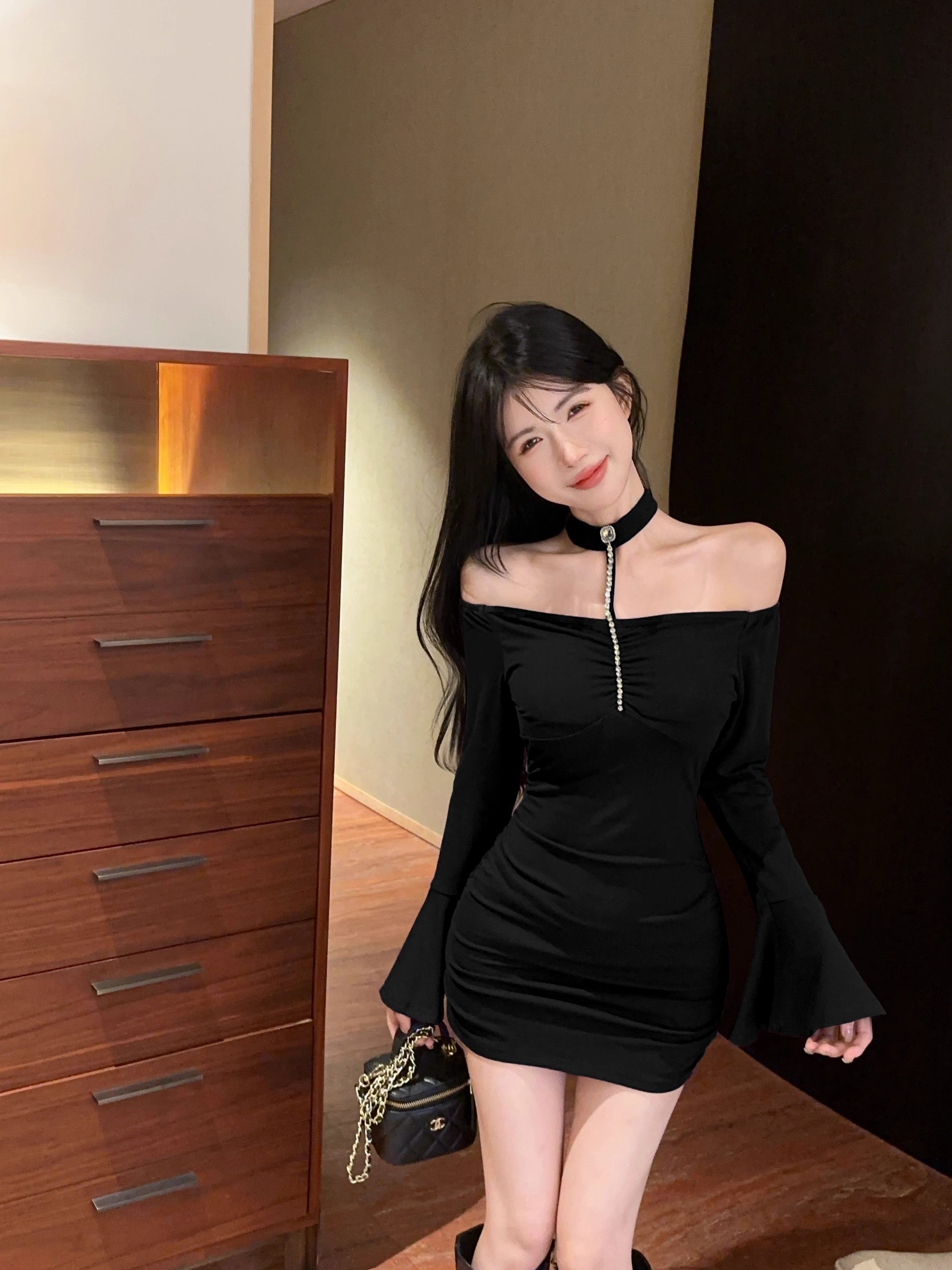 • 烫钻挂脖紫色连衣裙女秋冬名媛包臀小妈裙显身材喇叭袖一字肩裙子
