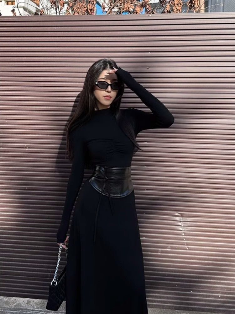 • 赫本风气质黑色半高领长袖连衣裙女秋冬新款收腰显瘦内搭包臀短裙