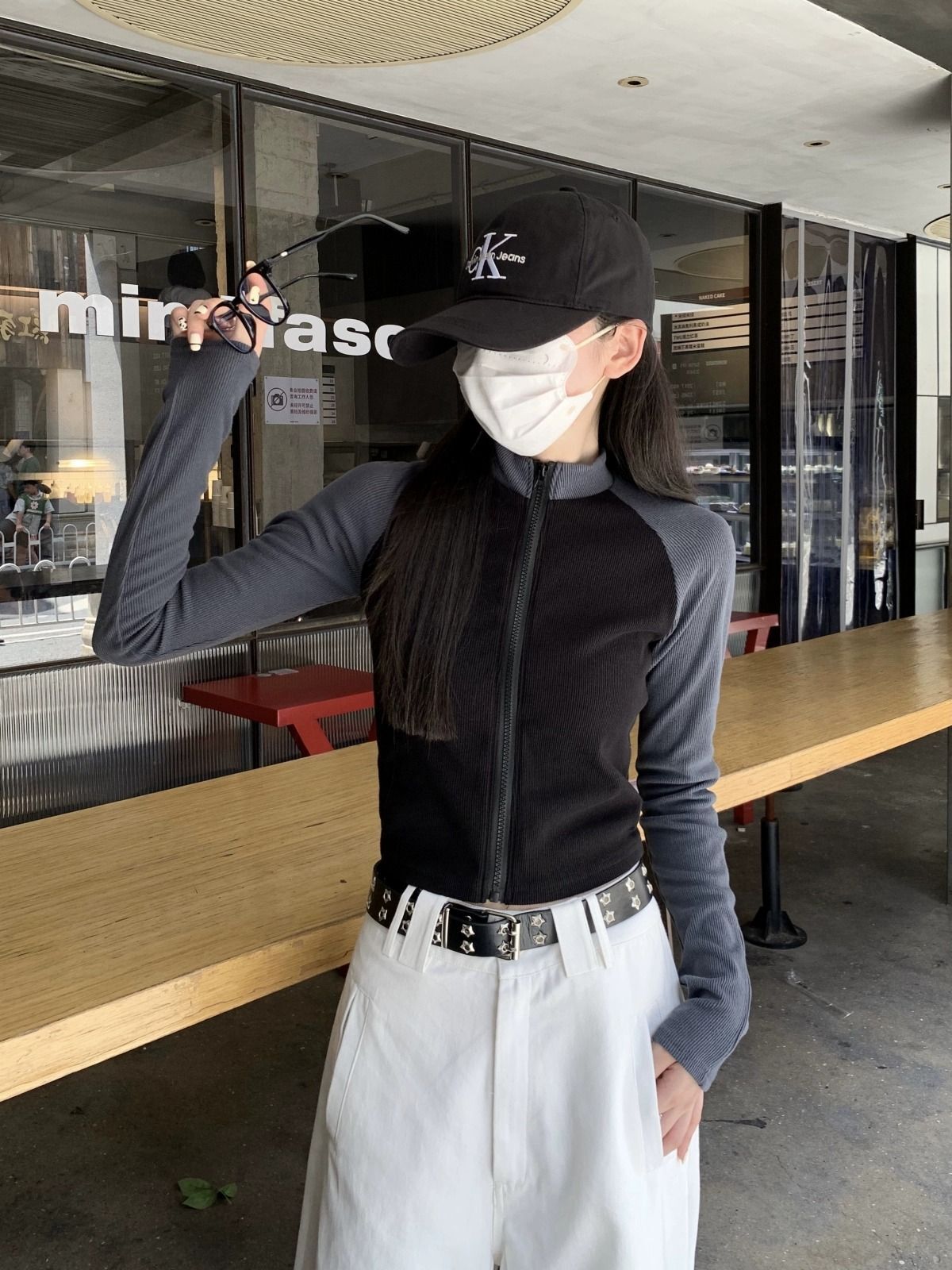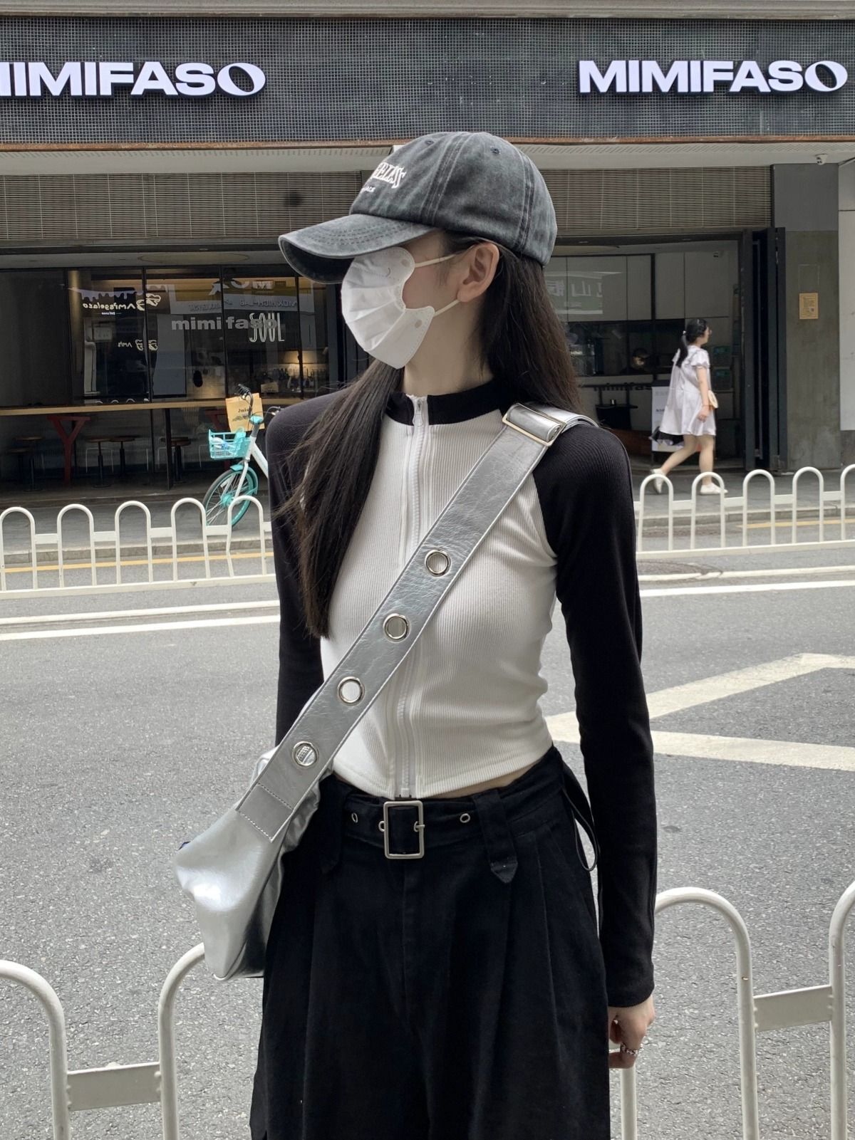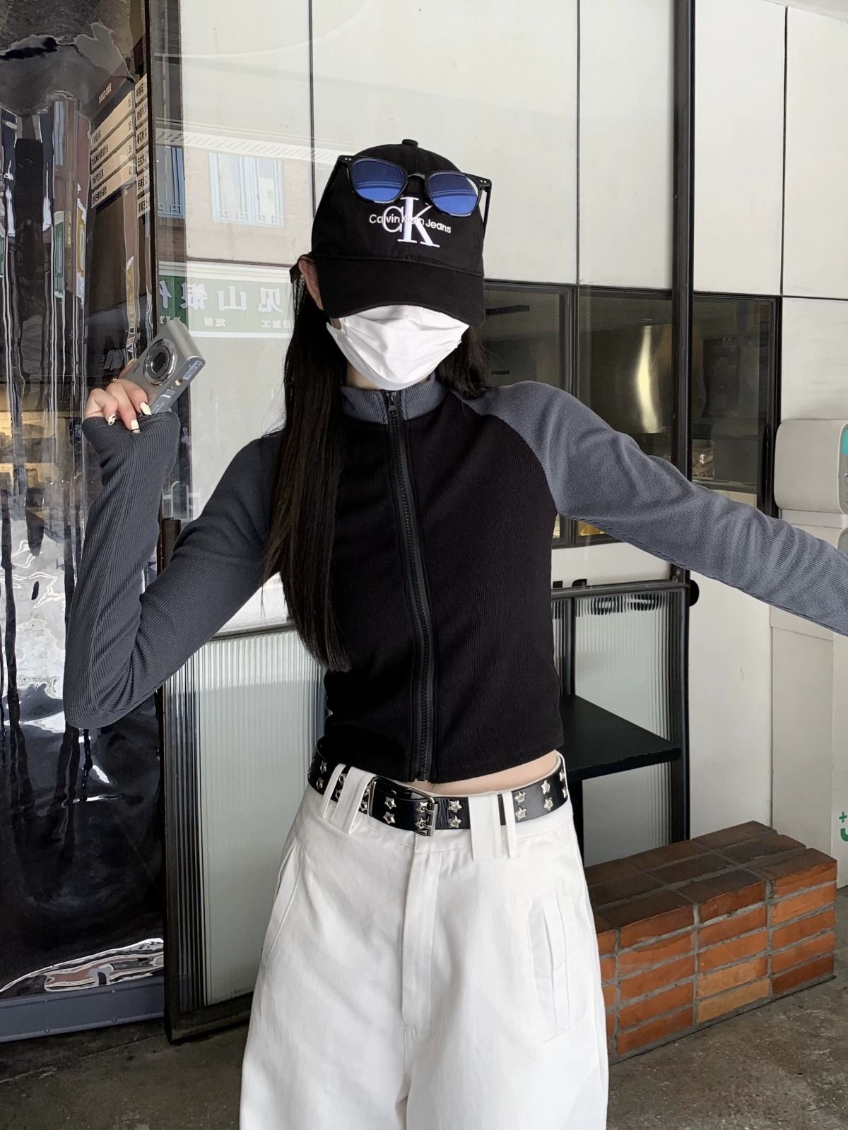 • 甜酷风立领撞色拼接长袖T恤女秋季气质修身显瘦短款上衣