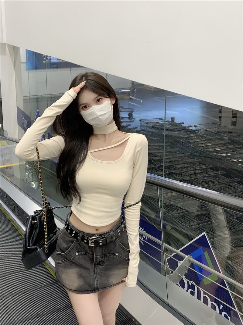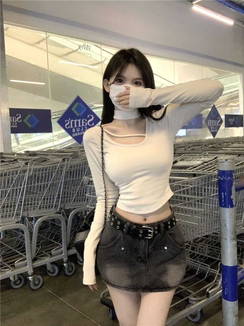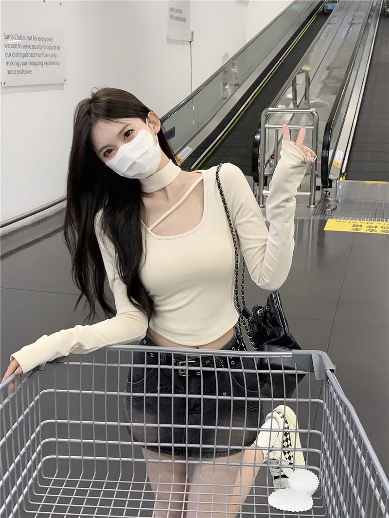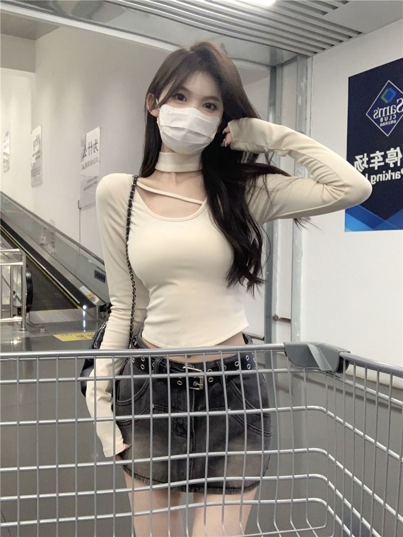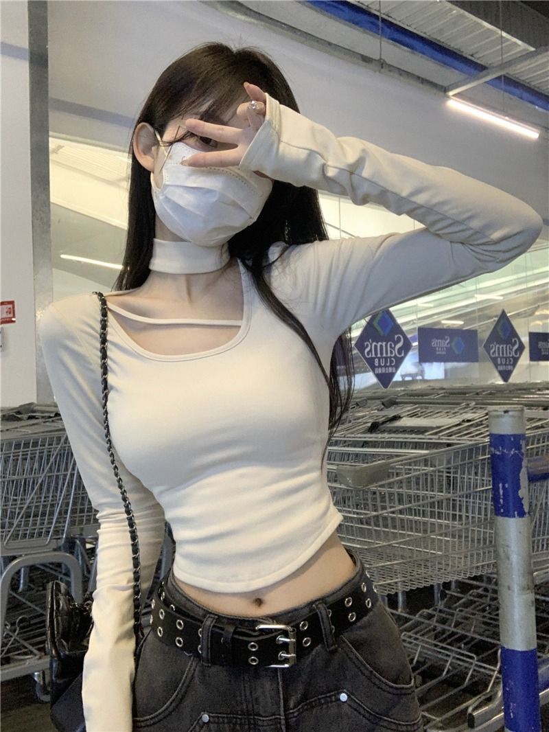 • MR【螺纹德绒】秋冬内搭打底衫上衣设计感挂脖半高领修身短款t