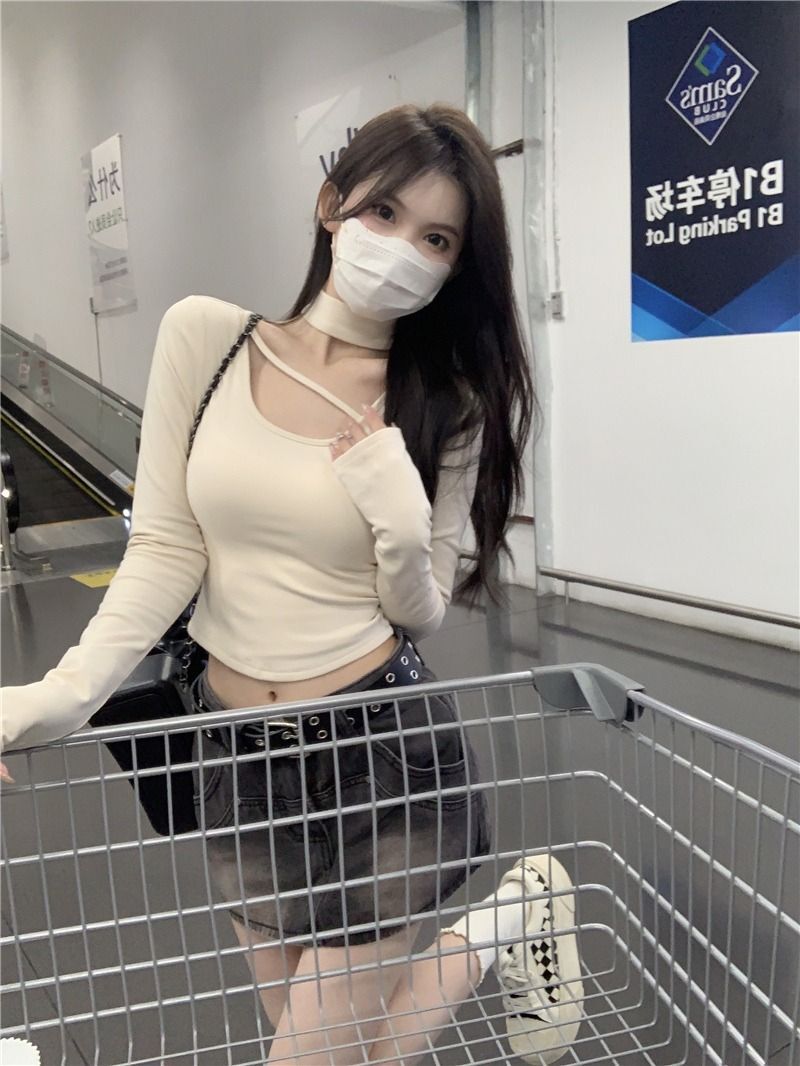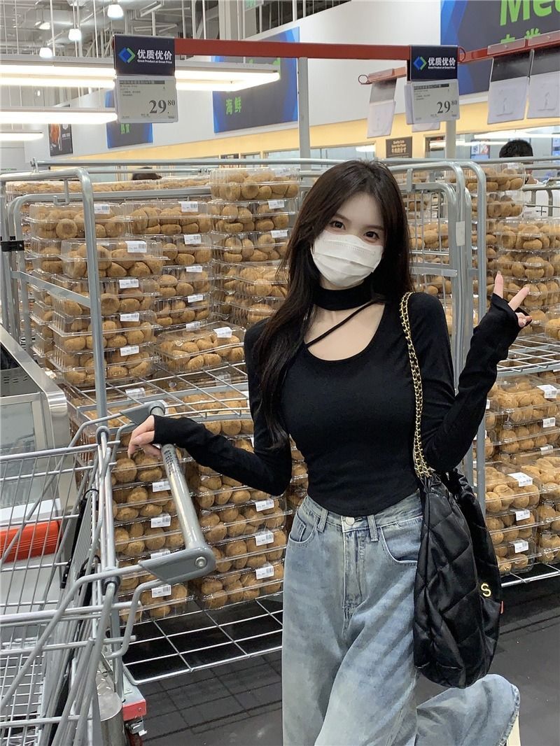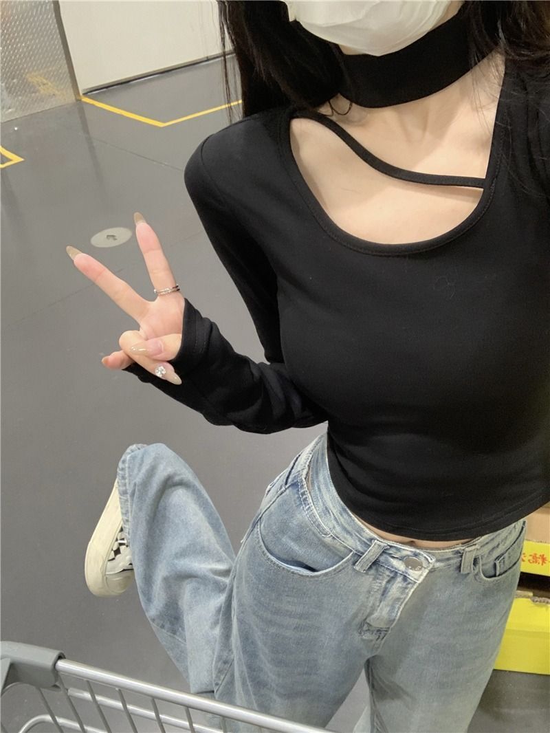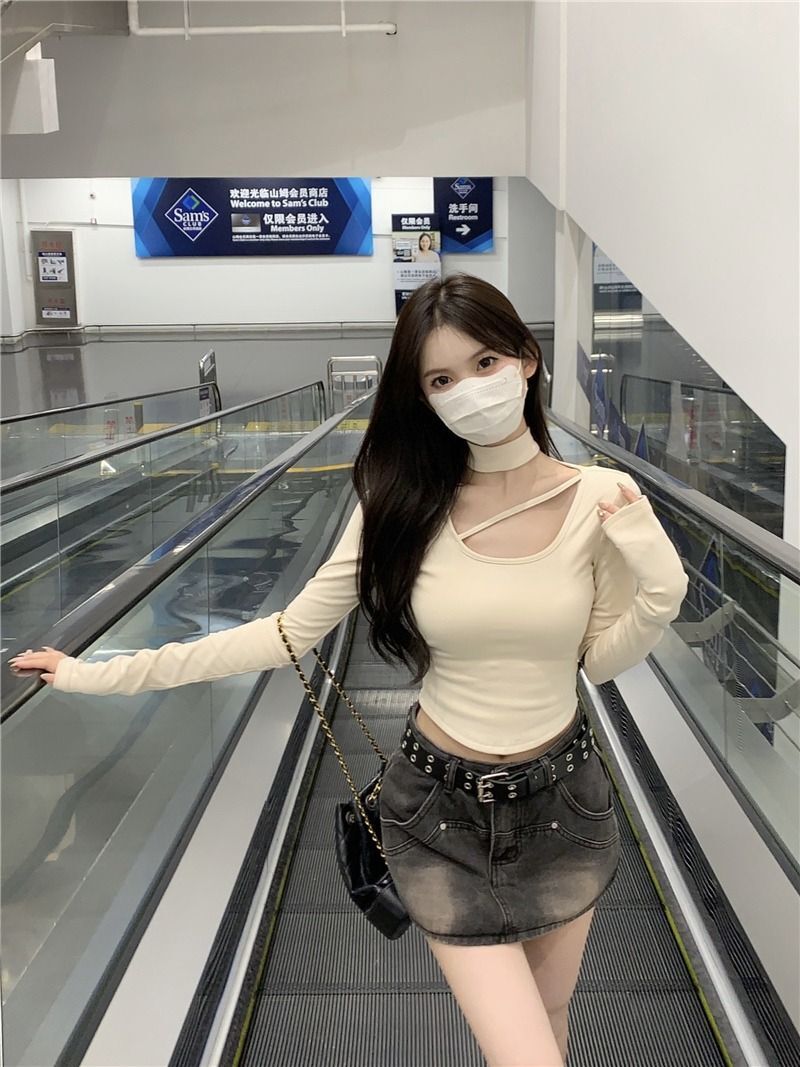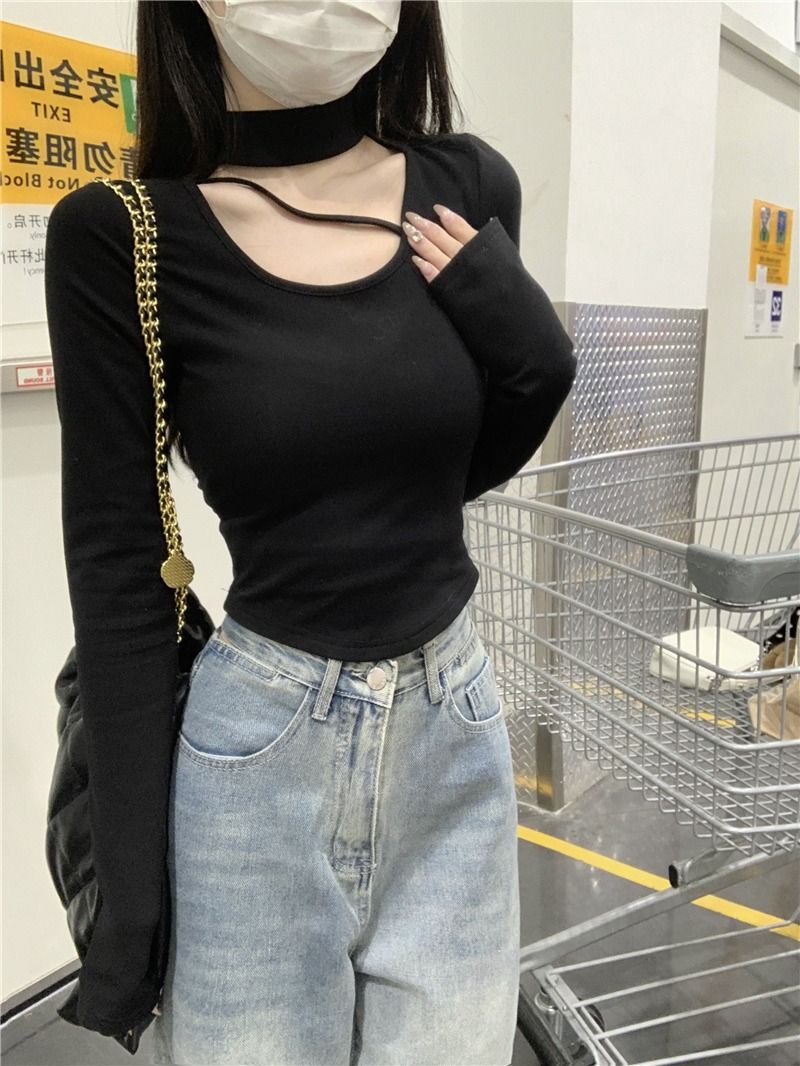 • MR【螺纹德绒】秋冬内搭打底衫上衣设计感挂脖半高领修身短款t