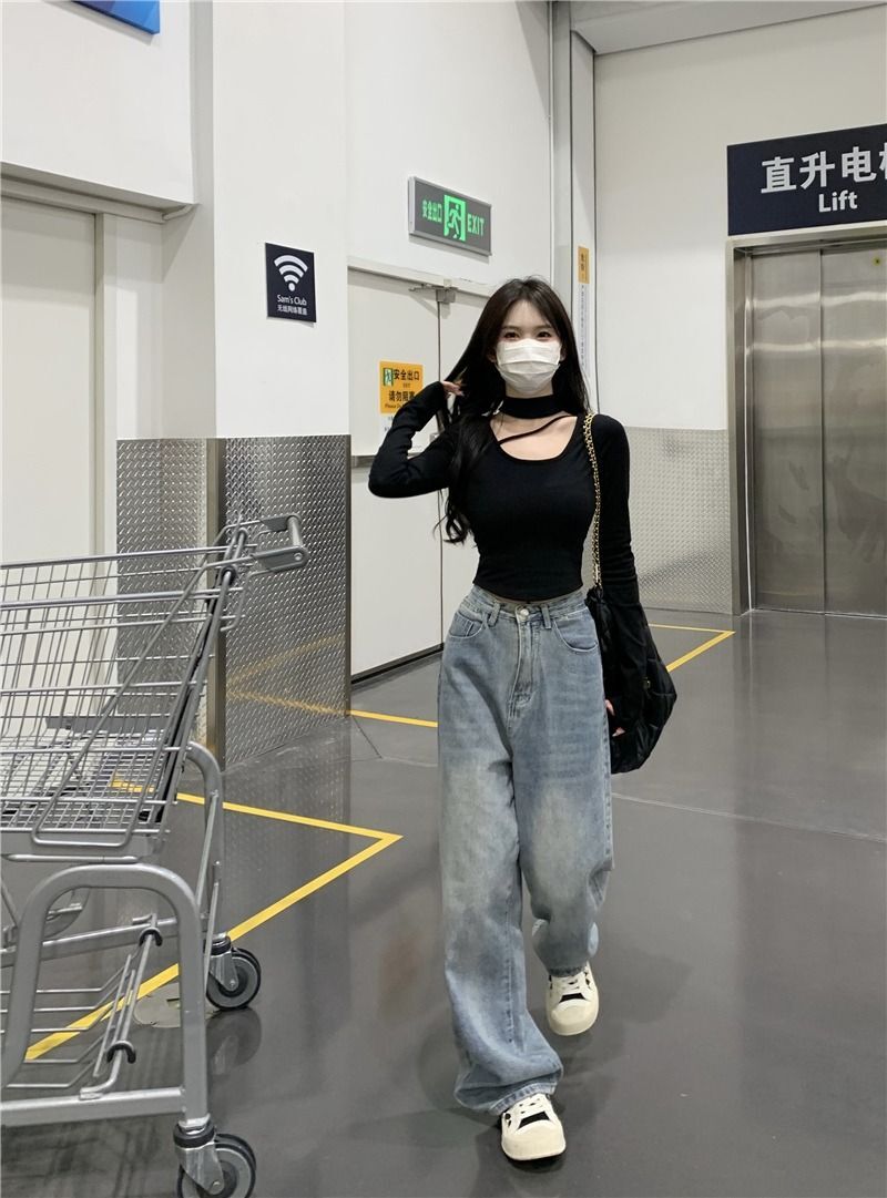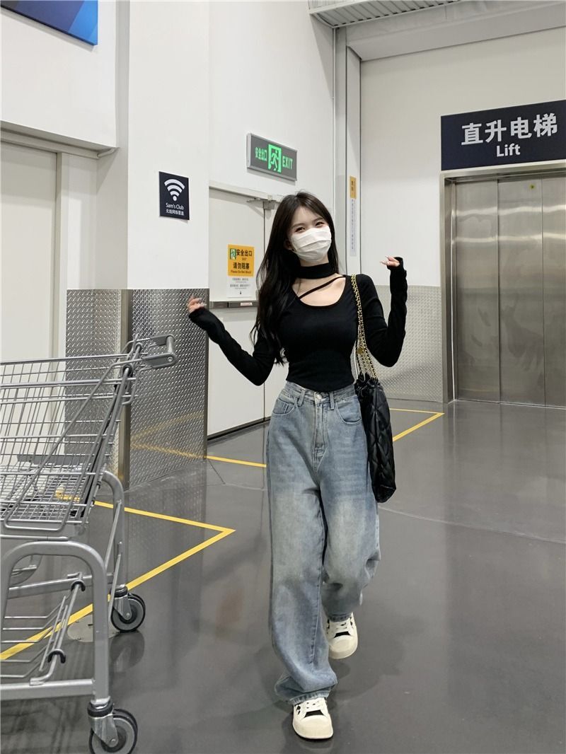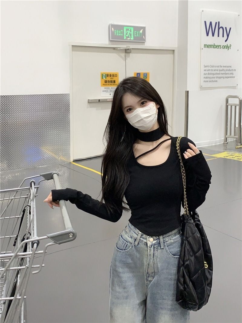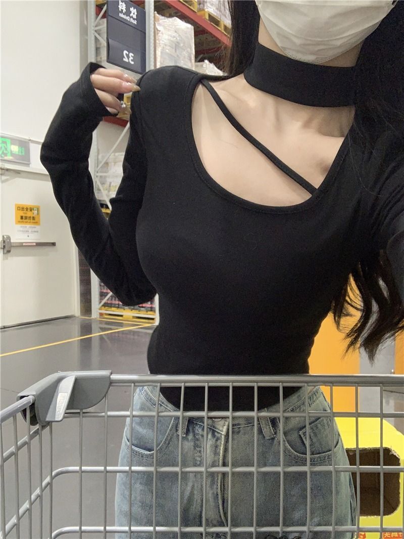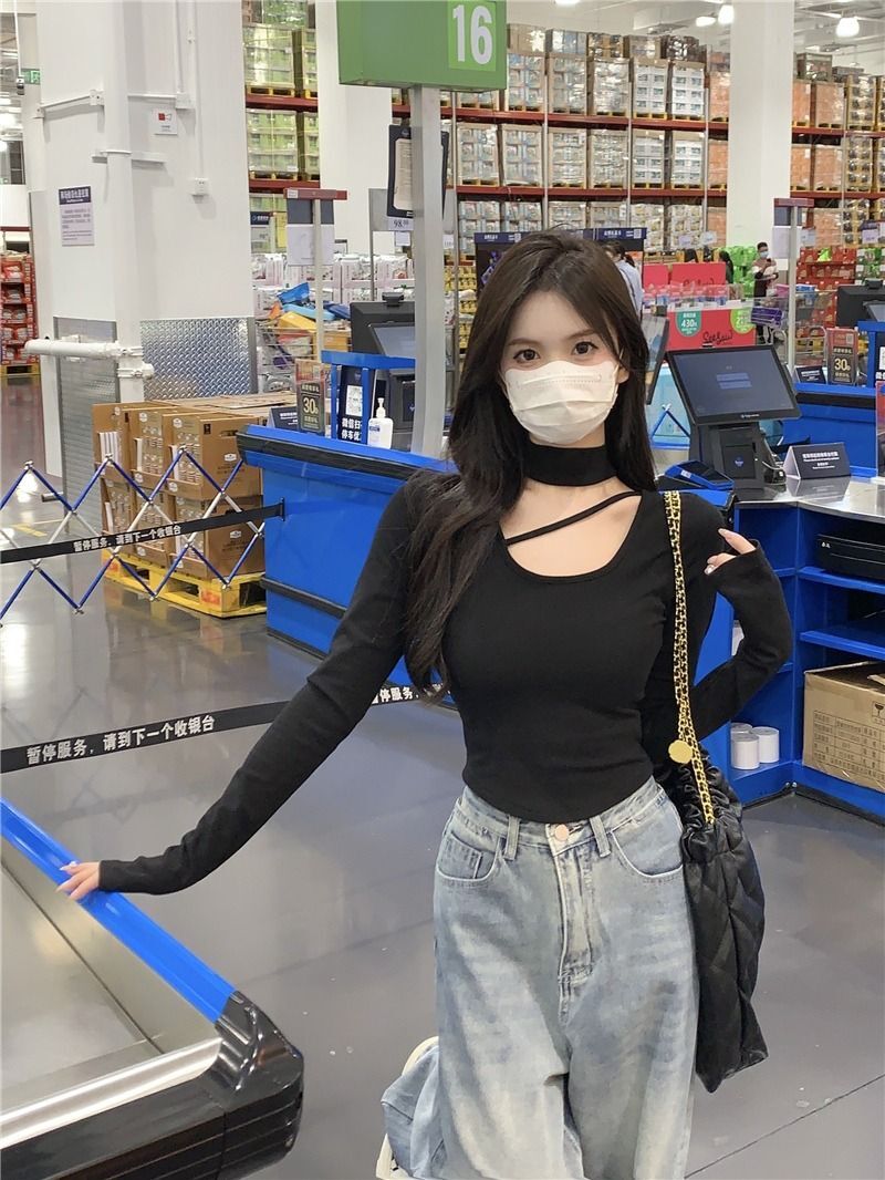• MR【螺纹德绒】秋冬内搭打底衫上衣设计感挂脖半高领修身短款t