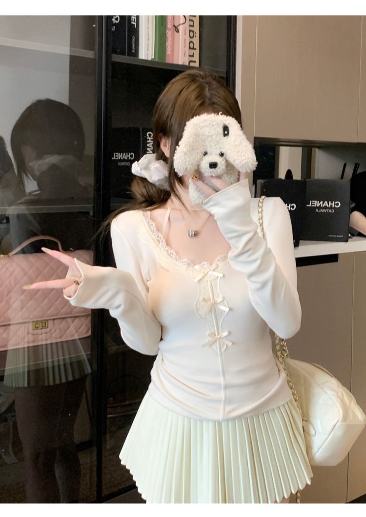 • MR【螺纹德绒】甜美蝴蝶结蕾丝拼接U领长袖T恤修身显瘦打底上