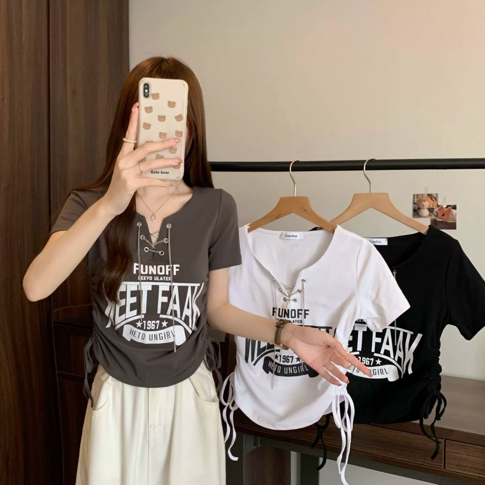 大码美式复古印花V领短袖T恤女2023新款夏季胖MM抽绳短款辣妹上衣