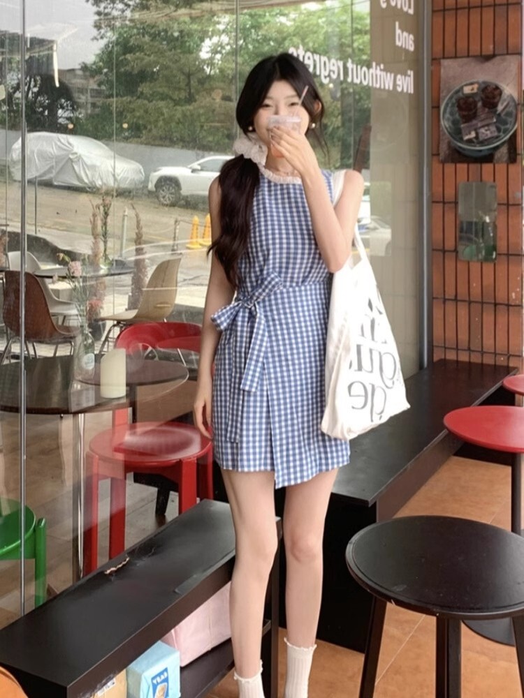 • 蓝色格子无袖连衣裙女设计感夏季绑带蝴蝶结短款背心裙收腰短裙子