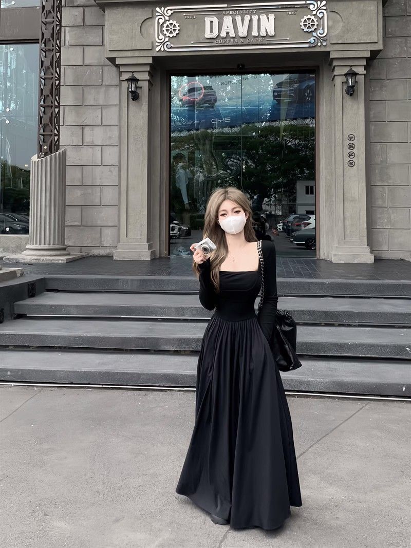 • 假两件方领长袖连衣裙女早秋2024新款绝美气质收腰显瘦a字长