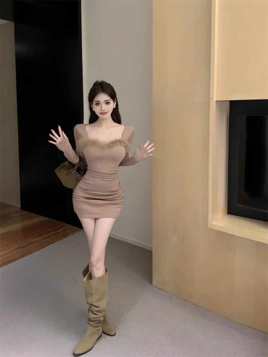 • 美拉德毛毛方领连衣裙女秋冬纯欲性感包臀小妈裙短裙打底内搭裙子