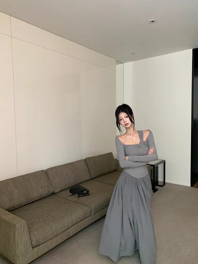 • 灰色斜肩长袖连衣裙女秋冬季新款法式气质修身收腰显瘦A字长裙子