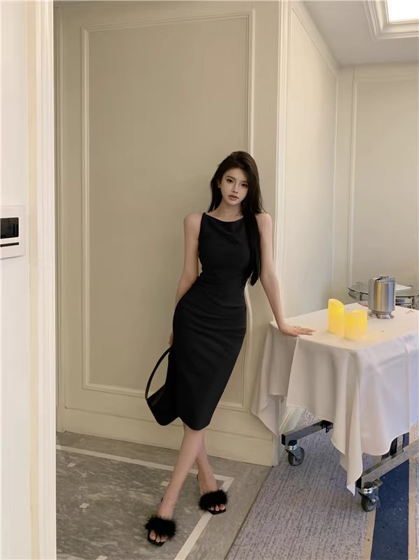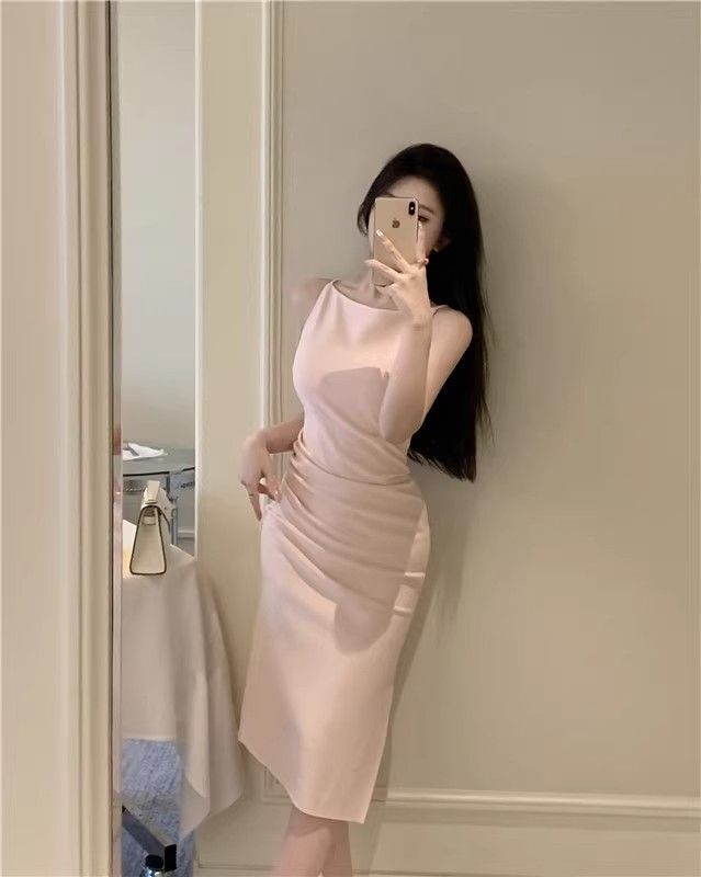 • 法式绝美一字肩粉色连衣裙女夏季修身收腰甜辣妹性感吊带包臀长裙