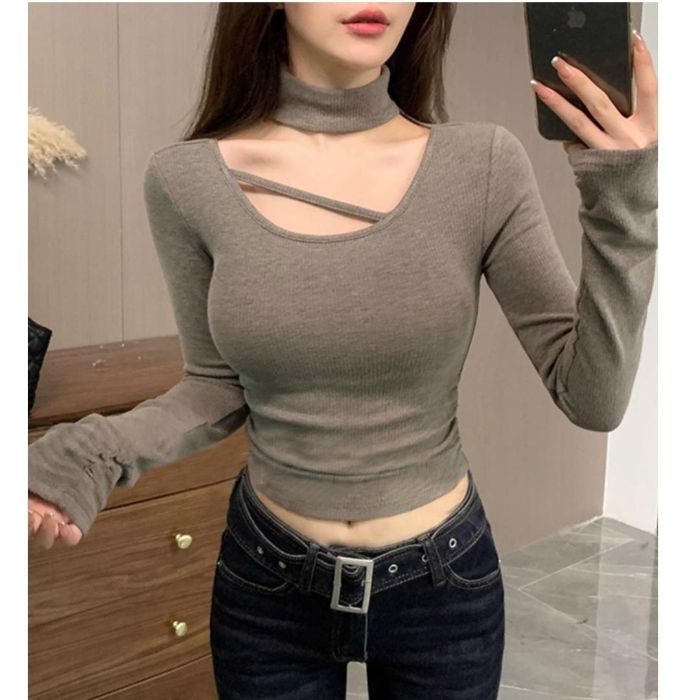 • MR【螺纹德绒】秋冬内搭打底衫上衣设计感挂脖半高领修身短款t