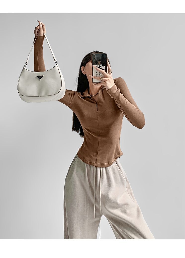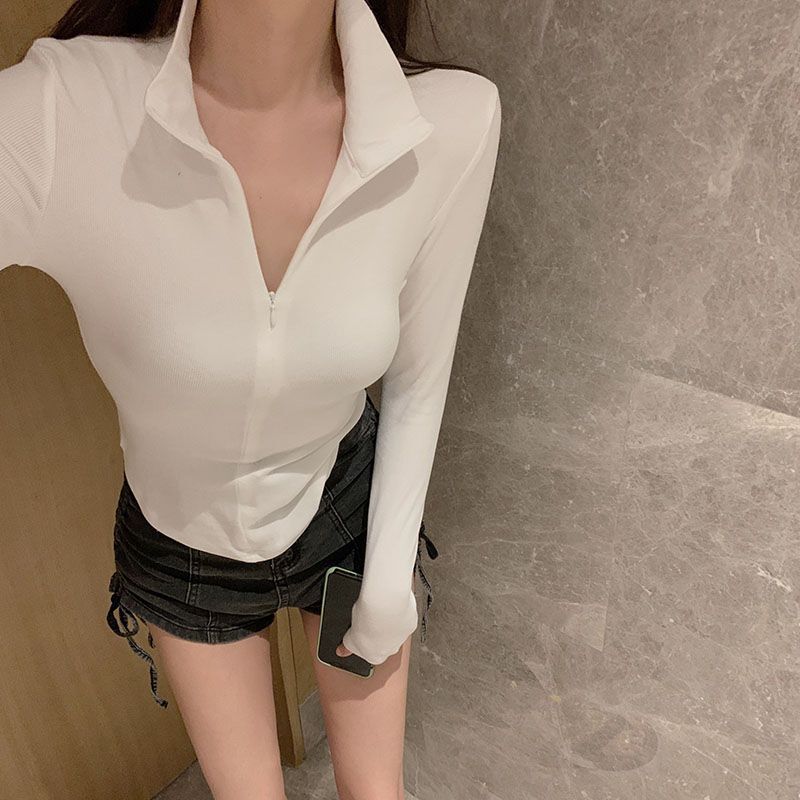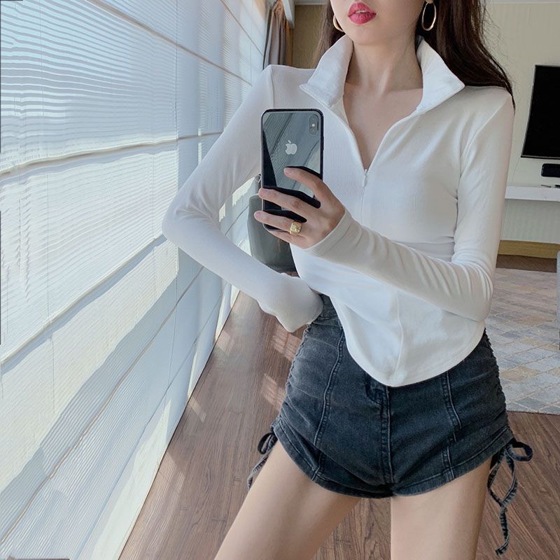 • 【现货】欧美风弹力紧身翻领长袖T恤女辣妹收腰内搭打底衫上衣潮