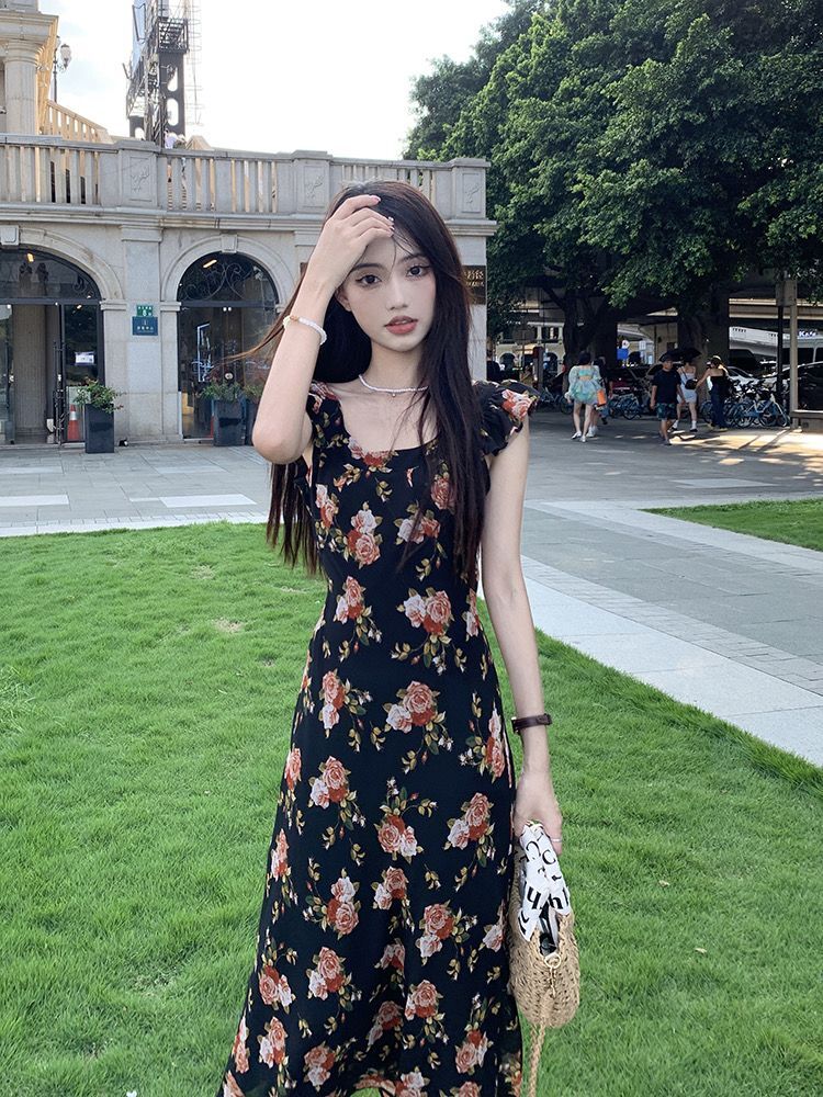 法式复古碎花连衣裙女夏季2025新款飞飞袖设计感收腰显瘦A字