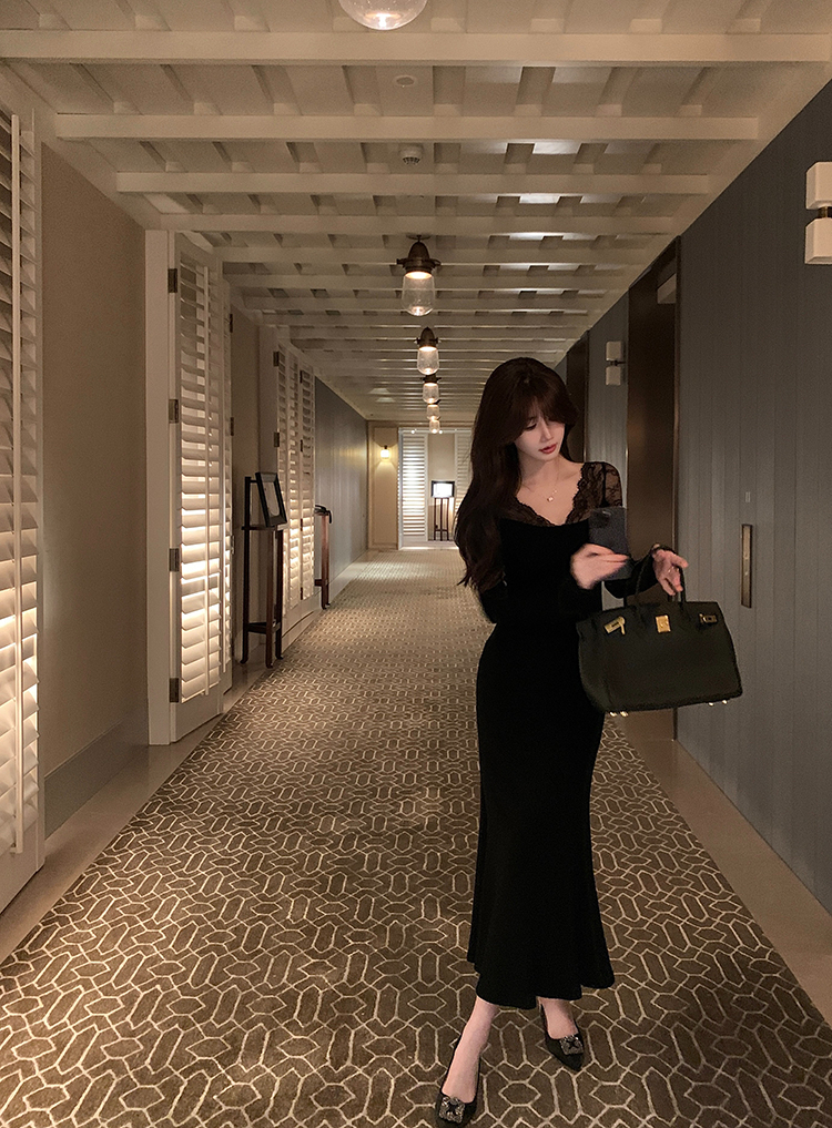 • 包臀鱼尾连衣裙女早秋高级气质收腰修身长裙2025新款V领蕾丝