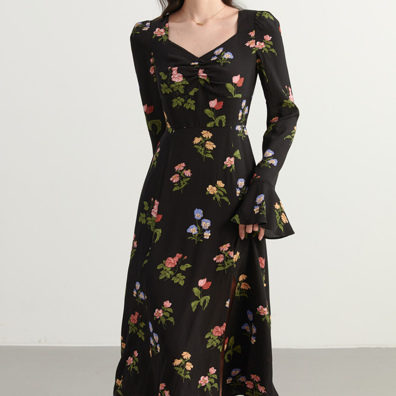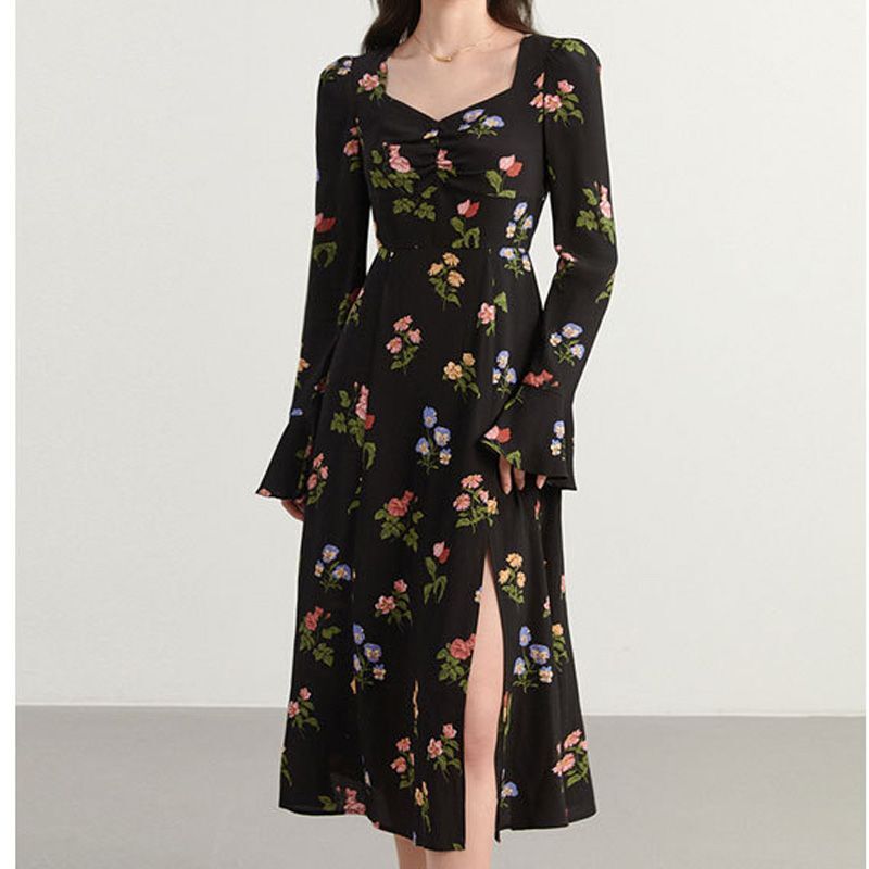 • 2025新款春秋大码女装中长裙子法式复古好看收腰侧开叉连衣裙